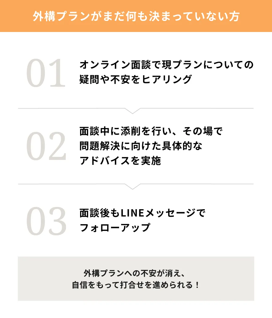 - 当サービスはオンライン面談を基にした図面やパース等の資料作成のみとなります。